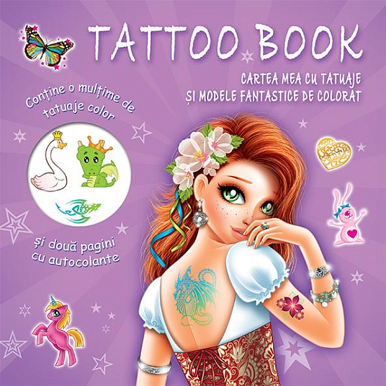 O minunată colecție pentru micuții artiști. În această carte, fetițele vor găsi o întreagă pagină cu tatuaje temporare color, ușor de aplicat, dar și de îndepărtat, pe care să le împartă cu prietenele. Vor găsi în interior și două pagini cu autocolante pentru a crea o înfățișare modernă celor 48 de modele superelegante, pe care le pot colora după placul lor.